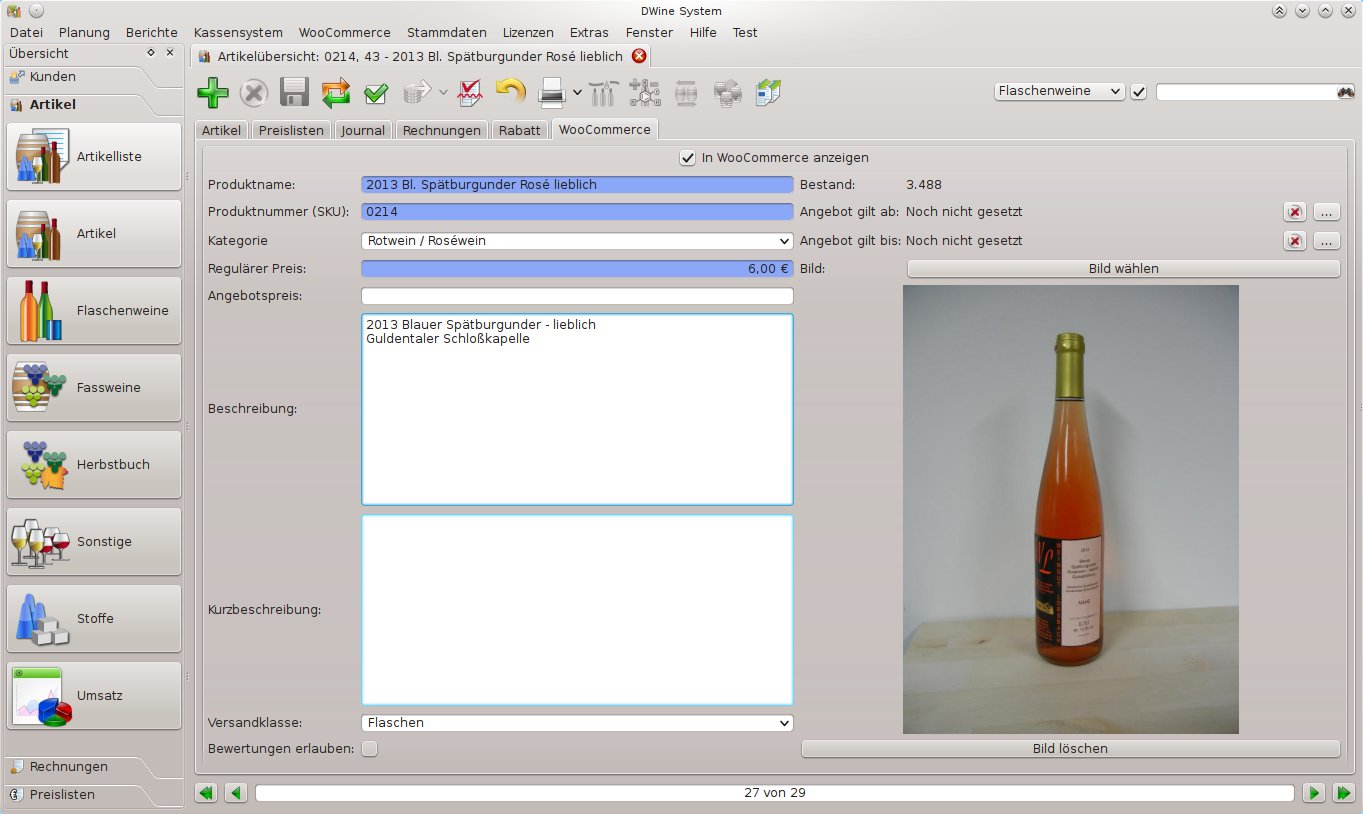 Im DWine Client wählen Sie die gewünschten Artikel aus, geben noch einen Beschreibungstext ein oder wählen ein ansprechendes Artikelbild aus und fertig ist der Eintrag für den Online-Shop. Alle weiteren Daten, wie z.B. Rebsorte, Weinlage, analytische Werte,… werden aus dem Weinkonto übernommen.
